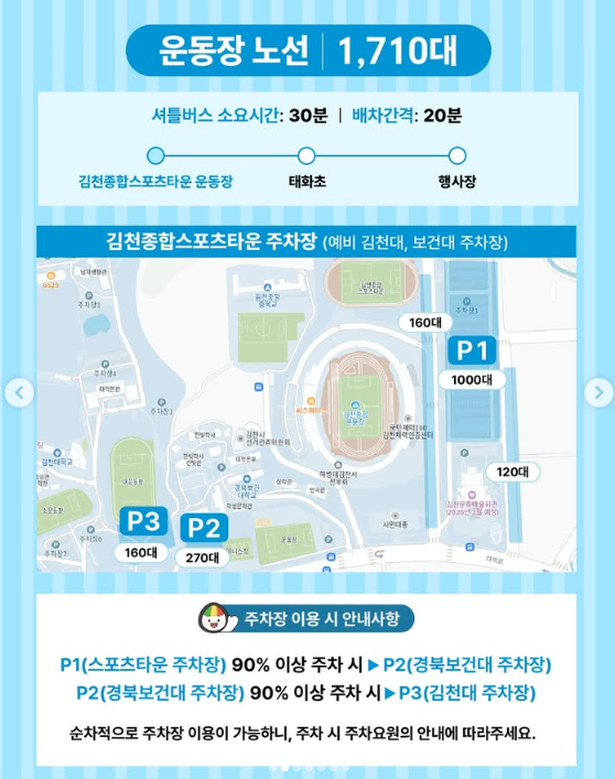 가장 큰 규모를 자랑하는 종합스포츠타운 주차장은 총 1,710대를 수용할 수 있는 초대형 주차 공간입니다. P1(1,000대), P2(270대), P3(160대), 보건대 주차장(120대), 김천대 주차장(160대)으로 구성되어 있으며, 셔틀버스를 타고 약 30분 정도 소요됩니다.