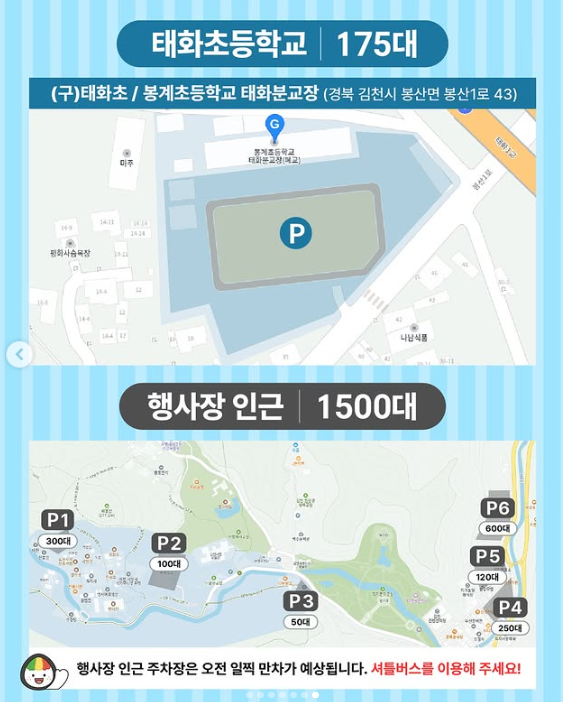(구)태화초/봉계초등학교 태화분교장 부지를 활용한 임시 주차장입니다. 주소는 경북 김천시 봉산면 봉산1로 43이며, 행사장과의 거리도 가까운 편입니다.