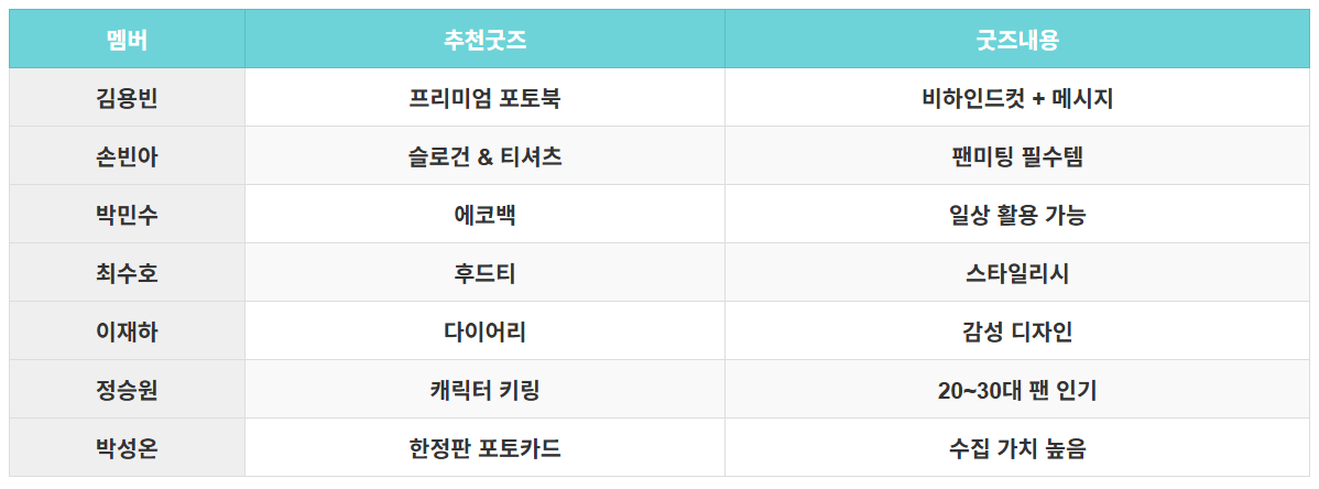 🎯 TOP7 멤버별 추천 굿즈 & 팬 인기템