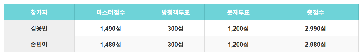 ※ 두 사람의 총점 차이는 단 1점! 마지막까지 예측 불허의 접전이었죠.