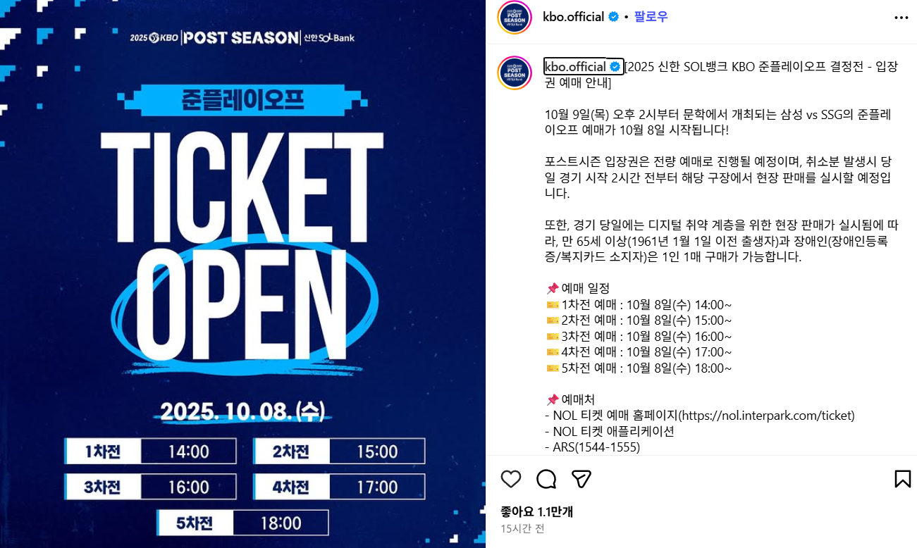 이번 준플레이오프의 입장권 예매는 10월 8일(수요일) 오후 2시부터 단계적으로 진행됩니다. 경기별로 오픈 시간이 다르므로 원하는 경기를 놓치지 않기 위해서는 시간 확인이 필수입니다. 모든 예매는 NOL 티켓을 통해 진행되며, 예매 시간 10분 전부터 대기 페이지에 입장하는 것이 좋습니다.