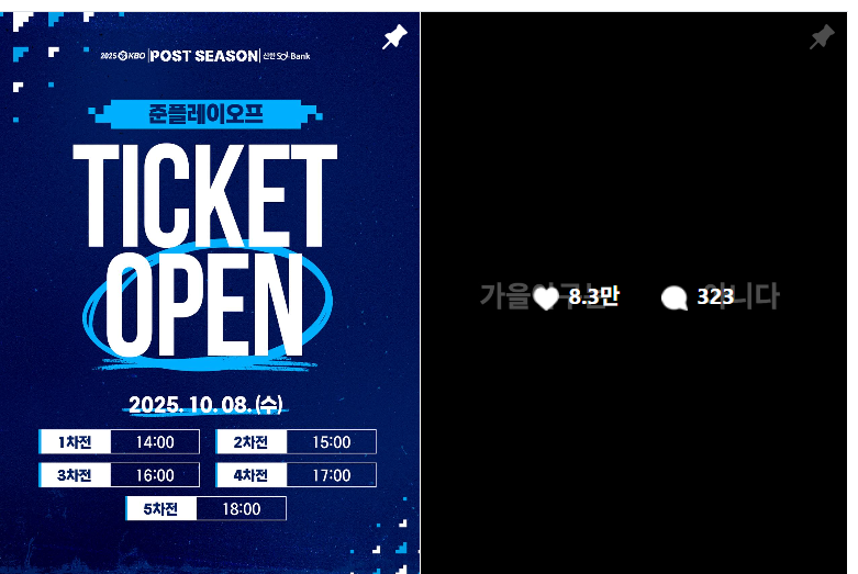 | 10월 8일(수) | 오후 3시 | 10월 10일(금) 준플레이오프 2차전 | 문학 |