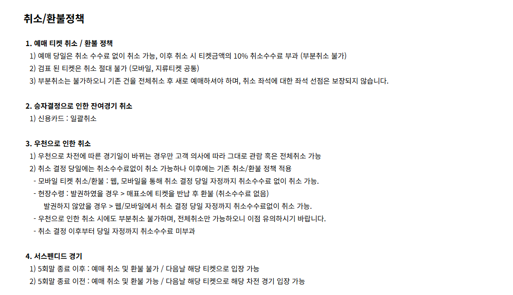 - 우천 취소 시: 경기 전 공식 발표 후 환불 가능