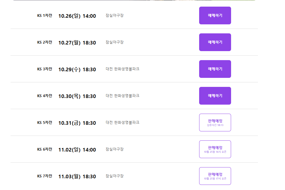 이번 포스트시즌 한국시리즈는 총 7경기 일정으로 구성되어 있으며, 각 경기별 장소와 시간, 예매 가능 여부가 다릅니다. 예매는 25일 오전 11시부터 ~ 오후 5시까지 시간별로 경기 예매 할수 있습니다.