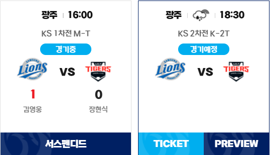 2024 KBO 한국시리즈 1차전은 10월 21일 오후 6시 30분에 시작되었으나, 6회 초 우천으로 인해 중단되었습니다. 우천취소된 한국시리즈 1차전 경기는 10월 22일 오후 4시에 재개될 예정었지만, 하루 더 연기되어 10월 23일 수요일 오후 4시로 일정 변경되었습니다. 1차전 종료 후 1시간 후에 한국시리즈 2차전도 이어서 진행됩니다. 이 경기는 KBO 리그 역사상 첫 서스펜디드 선언이 이루어진 경기로, 많은 팬들이 기대하고 있습니다.