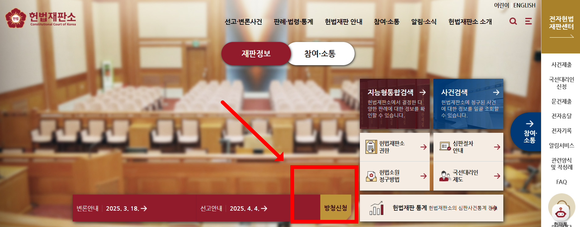 헌법재판소는 이번 심판 선고에 대해 일반 국민의 방청을 허용한다고 밝혔으며, 누구나 헌재 홈페이지를 통해 방청을 신청할 수 있도록 했습니다. 다만, 제한된 좌석 수 때문에 전자추첨 방식으로 당첨자를 선정하니, 신청 방법과 주의사항을 꼭 확인하고 참여해야 합니다.