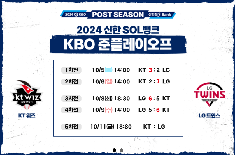 2024 KBO 준플레이오프 운명의 5차전이 드디어 성사되었습니다. KT 위즈와 LG 트윈스는 각각 시리즈 전적 2승 2패로 팽팽하게 맞서며 2024 KBO 준플레이오프 5차전으로 플레이오프 진출을 결정짓게 됩니다. 이번 경기는 양 팀의 플레이오프를 향한 마지막 경기로 매우 중요한 만큼 팬들의 기대가 높아지고 있습니다.