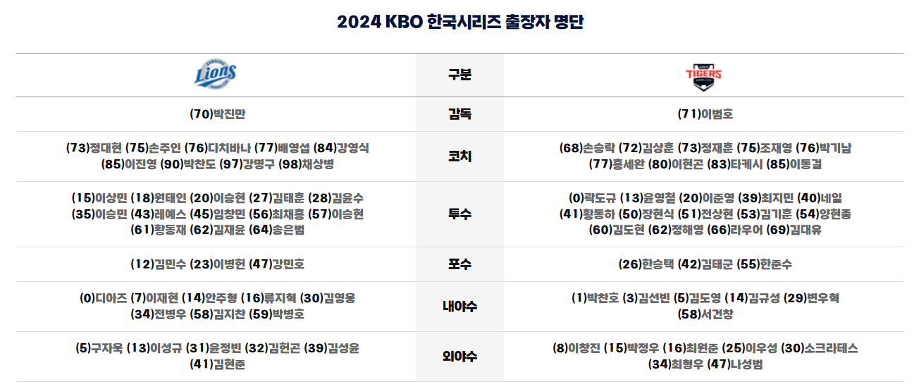 - 삼성 라이온즈: 9년 만에 한국시리즈에 진출한 삼성은 플레이오프에서 보여준 기세를 이어나갈 계획입니다. 구자욱을 중심으로 한 공격력이 변수로 작용할 수 있어요.
