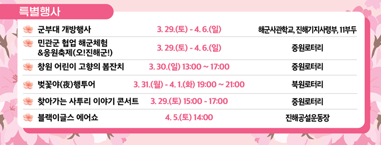| 군부대 개방행사 | 3.29 ~ 4.6 | 해군사관학교, 진해기지사령부, 11부두 |