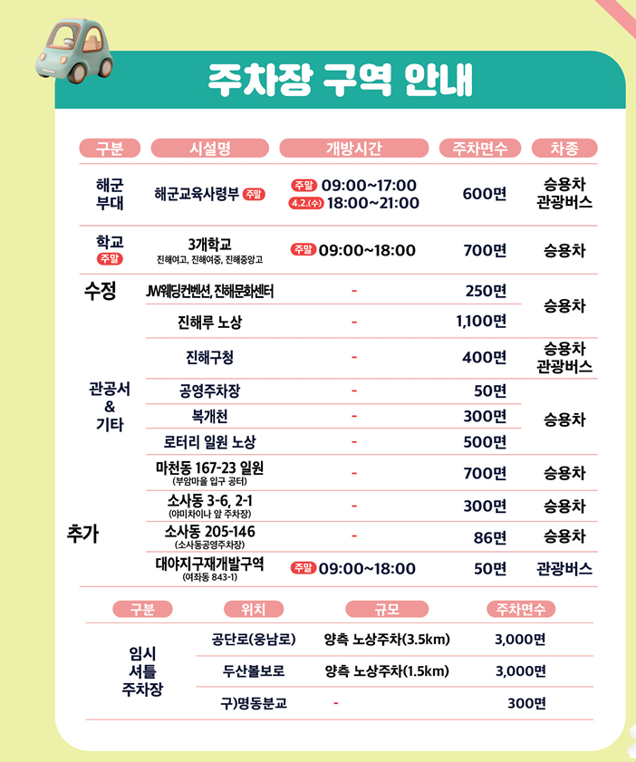 | 진해공설운동장 인근 | 빠른 만차 예상, 오전 방문 추천 |