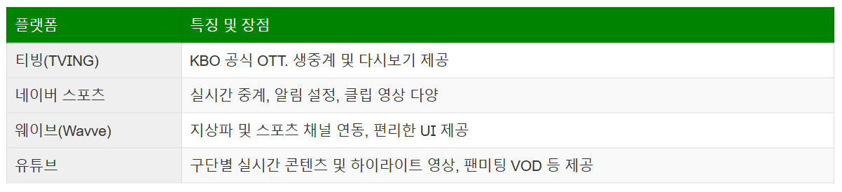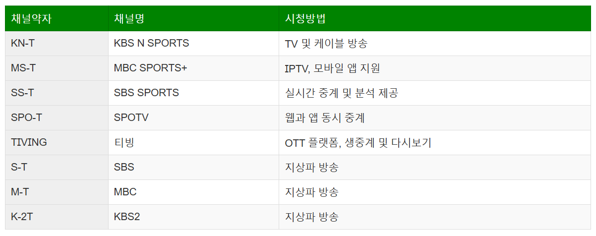 - 실시간 및 다시 보기는 티빙, 네이버 스포츠, 유튜브 활용